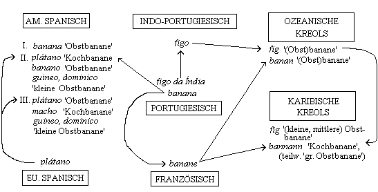 Den Weg über das Portugiesische und über Westafrikakönnen wir ausschliessen, da figo da Índiaja im lusophonen Amerika nicht vorkommt, und diese diatopischeDifferenzierung offenbar bereits im 16. Jahrhundert bestand. Möglichwäre auch der Umweg über das Französische, wo figued'Inde 'Banane' in der Tat belegt ist (DECFOI, s.v. "fig";bestritten von Chaudenson 1974, 560). Doch ist auch dies wenigplausibel, denn der weitaus gängigere französische Nameder Banane im 17. und 18. Jh. war banane. 14Nun gibt es einen gewissen Teil des kreolischen Lexikons, dernicht akrolektalen Ursprungs ist und der sich dennoch in beidengroßen französisch-basierten Kreolbereichen findet.Chaudenson spricht hier vom "Vocabulaire des 'Isles'"(1974, 591-632). Es handelt sich dabei um Bezeichnungen verschiedenenUrsprungs für Flora, Fauna sowie bestimmte Besonderheitendes Koloniallebens, die "kreolweite" Verbreitung gefundenhaben, wie z.B. balizyé 'Zuckerrohrart' (Chaudenson1974, 601). Typischerweise kommen diese Wörter zunächstin der Karibik auf und werden dann von Kolonisten und Seeleutenauf den wenige Jahre später besiedelten Inseln des IndischenOzeans verbreitet (Chaudenson 1974, 593f.). Im Falle von fig dürfte der Verbreitungsweg genauumgekehrt gewesen sein: vom Indischen Ozean in die Karibik. Diesmag der Grund sein, warum Chaudenson fig nicht unter "Vocabulairedes 'Isles'" rubriziert, jedoch ist diese Hypothese nachdem Gesagten am plausibelsten: Wenn Schiffe von der Karibik inden Indischen Ozean fahren, müssen auch welche zurücksegeln,wenn Kolonisten von den Antillen nach Afrika, Madagaskar oderRéunion wandern, können sie auch die Rückreiseantreten; schließlich: Bananenpflanzen kommen nicht nurvon Afrika aus in die Karibik, sondern auch direkt aus dem IndischenOzean.