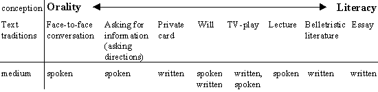 Please be conscious of the fact that spoken discourses are not always "oral". There are spoken text traditions belonging to the literal part of the continuum and vice versa. The genres on the literal part of the continuum are fairly well known, while some of the ones belonging to the oral part have not yet been studied at all. While the above cited authors are focusing on the differences between orality and literacy at the universal level, I propose to re-interpret this continuum, collocating the linguistic manifestations , e.g. the texts and discourses along the same scale at the actual level. The underlying distinction between actual, historical and universal levels (Coseriu 1988a: 250-265, 1988b: 57-185) represent possible abstractions drawn from the real data, the only source to which we have direct access. This distinction situates the language as an activity actualizing generation by generation the traditional ways to talk and write at the historical level. Focusing on the contrasts between orality and literacy, the students of Coseriu felt it necessary to double this historical level by introducing a second abstraction representing the models which the speakers and hearers follow when creating a new text or discourse using the respective text tradition (Schlieben-Lange 1983, Koch 1997).