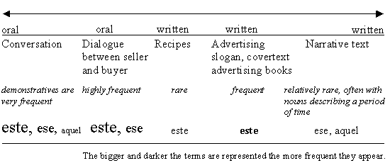In most of the face-to-face-communications in Spanish the use of the demonstratives is limitated to este and ese. There are only a few data which show the use of aquel. Most of them exemplify the use in the space of time denoting a distant past. The examples cited above are therefore especially valuable. While in the first example the apples are behind the addressee, the receptacle holding the milk in the second example is behind the speaker. This last case is difficult to find, because there are only very special circumstances which force the speaker to talk about things he cannot see. He/She only can talk about them in cases where their existence is well-known to him/her and normally the audience has visual access to them. But the examples remain quite isolated and the findings need to be prooved further. There is little probability that the ternary system of demonstratives in Spanish will be reduced to a binary one. First the focus on the distribution along the gradatum between orality and literacy shows that the oral text traditions or genres make different choice - most frequently este, quite frequent ese, which serves for cohesion above all, very rarely aquel - than the literate ones - all demonstratives are relatively rare: some este doing cohesive work, some ese used often anaphorically with reference to a shortly before mentioned noun or concept, less aquel. The demonstratives in general are a lot more frequent in oral text traditions, especially when they are performed in face-to-face interaction. Secondly there are certain combinations where the respective demonstrative is obligatory or quasi obligatory.14 Announcing a restrictive relative clause aquel is in modern Spanish15 obligatory, in cataforic function este is very likely to be used. There are a lot of idioms, most of them build with ese. But in order to contrast in text deictic function between the former and the latter este and aquel form a fixed pair only used in written text traditions. |