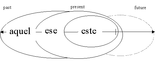 If we start from the assumption that the deictic procedures are achieved and developed in natural contexts (three-dimensional space) than there are several possible transfers into other spaces and within the Spanish system allows them all. By tranferring the system of the three terms to the space of time we combine the present with este, the past with ese and the long ago with aquel. When talking about the future which is always a precarious concept the speakers tend to expand their origo into the future, but the other terms are possible as well, if the speaker wants to emphasize the respective space of time as being separate of the present.8