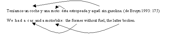 By transferring the terms to the space of the text, a reduction to a two-dimensional space is included. The text deictic functions are different from the functions in face-to-face-conversation. Above all there is a lot of work to be done in order to make the text cohesive. Ese is used to refer anaphorically to the previous phrase, it is often used with prepositions and there may be a noun after it. Este connects the parts of the text as a whole in the two directions: backwords, e.g. anaphorically and forewords, e.g. cataphorically. Este shows a bigger scope, it prefers the first place in the phrase. When referring to two concepts mentioned before, the linearity of the text is reinterpreted in time. Aquel refers to the noun first mentioned, farer away from the origo which is the point in the text where the reader "is right now", while este refers to the term last mentioned, which is nearer to the point, he/she is at that moment. This use may be called iconic.