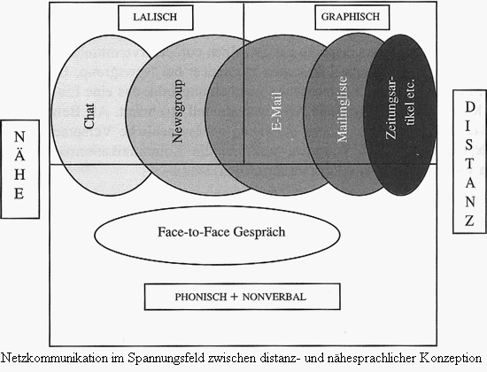 Die Neuen Medien bringen nun offensichtlich auch spezifische Formen des Sprachgebrauchs hervor, ein Umstand, der Experten und Laien gleichermaßen interessiert und erregt. Es scheint so, dass über die Neuen Medien bestimmte Formen der Mündlichkeit in die Schriftlichkeit eingehen, da einerseits diese im Wesentlichen den Gebrauch der seit Erfindung der Schreibmaschine bekannten Zeicheninventare erfordern, andererseits jedoch unter Kommunikationsbedingungen stehen, die eher denen der Mündlichkeit entsprechen. Am auffälligsten ist dies im Chat, wo eine Vielzahl von Personen in Echtzeit quasi-synchron schriftlich miteinander kommuniziert.