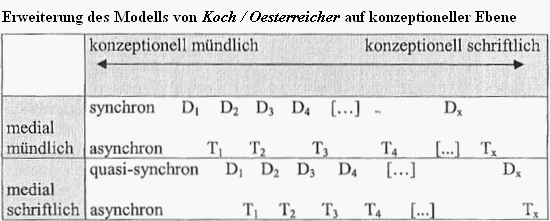 3. Medien und KommunikationsbedingungenKoch / Oesterreicher betonen zwar immer wieder (Oesterreicher 2001: 220), dass die Liste der Parameter eine offene ist. Sie haben sie jedoch nach kleineren Präzisierungen am Anfang (vgl. Koch / Oesterreicher 1985: 23; Koch / Oesterreicher 1990: 12) in 15 Jahren nicht mehr modifiziert oder ergänzt (cf. Koch 2005: 42). Es sollte indes bedacht werden, dass die mediale Dimension selbst zu den Kommunikationsbedingungen gehört (cf. Bittner 2003: 66; Kailuweit 2004). Wenn die Wahl der Ausdrucksmittel aber gerade nicht unabhängig von der Wahl des Mediums ist, dann würde dies das Modell von Koch / Oesterreicher aushebeln. Kattenbusch (2002), Berruto (2005) und Dürscheid (2003) haben in jüngerer Zeit versucht, einerseits an den Parametern von Koch / Oesterreicher zur Bestimmung der Konzeption festzuhalten und dennoch andererseits den Einfluss des Medialen auf die Wahl der sprachlichen Mittel zu berücksichtigen. Kattenbusch (2002: 192–195) schlägt vor, neben dem graphischen und phonischen einen "lalischen" Code (von gr. lalía ,Geplauder') als dritte mediale Realisationsform hinzuzufügen.