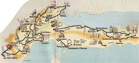Kollektivbewusstsein und nationale Identität können demzufolge an idealtypischen Landmarken festgemacht werden, die kulturspezifische Raumsemantik definiert sich seitdem in Italien besonders gerne über "la straordinaria, avvolgente, molteplicità dei paesaggi più diversi, così rapidamente avvicendantisi gli uni agli altri, talora nello spazio di pochi chilometri" (Galli della Loggia 1998: 27) – über ein Mosaik von diversen Landschaften, die zusammengesetzt 'Heimat' ergeben (sollen).7 Die schwer fassbare Einheit 'Landschaft' darf in diesem Zusammenhang als Produkt, Projekt sowie Projektion einer gemeinsamen Kultur angesehen werden und bietet den Stoff für gemeinsame Erinnerungen und Symbole, die die Gruppe verbinden und die Verständigung ermöglichen. Die Landschaft wirkt wie eine gewaltige Gedächtnisstätte für die Erhaltung von Tradition und Gruppenideal (Lynch 1968: 146). PhiN 60/2012: 77 Das itinerarische Prinzip der Heimaterzählung oder -aufbereitung wie auch die patriotische Fundierung des Territoriums anhand wirkungsvoller Rhetorik bzw. Topoi lassen Stoppanis Il Bel Paese somit als ideellen Verwandten respektive Vorfahren des Giro d'Italia erscheinen. Dieser bewerkstelligt letzten Endes nichts anderes, als dessen sinnstiftenden Grundgedanken in die Tat umzusetzen und jahraus jahrein zu sublimieren. Der Giro wird seit seiner ersten Austragung dementsprechend als "una straordinaria scuola en plein air" (GdS 04.06.2007) konzipiert und präsentiert. Die durchfahrenen Landstriche werden dabei (früher wie heute) mit dem pädagogisch-patriotischen Hintergedanken narrativ so aufgearbeitet, dass erzählter Raum zum Sinnträger avancieren kann: Örtlichkeiten erscheinen somit als pittoreske Essenzen, deren Schaffung und Konservierung sich an stereotypen Leitbildern mit hoher Einprägsamkeit respektive Attraktivität orientieren, um sich dauerhaft im kollektiven Bewusstsein festzusetzen. Auf diese Weise vollzieht sich die radsportliche Reise – hier an der berichterstattenden Aufbereitung der Italienrundfahrt 1909 demonstriert – immer mit Augen für "[i]l paesaggio […] delizioso" (GdS 24.05.1909 zit. nach Colombo 1998: 158), "la maestosità del panorama" (GdS 21.05.1909 zit. nach ebd.: 129) oder "le graziose sorprese di ristretti eleganti panorami" (GdS 24.05.1909 zit. nach ebd.: 157). Die Streckenführung ist dabei so gewählt, dass sie das Fahrerfeld durch "regioni pittoresche ed ubertose attravers[o] la penisola fiorita" (GdS 12.05.1909 zit. nach ebd. 1998: 33) führt, sodass beispielsweise "il verdissimo e floreggiante Abruzzo" (GdS 17.05.1909 zit. nach ebd.: 78), "[l]'Umbria […] costellata di piccoli borghi, ricca di colore e di poesia" (GdS 24.05.1909 zit. nach ebd.: 156), "[l]e frastagliate rocce di Liguria" (GdS 26.05.1909 zit. nach ebd.: 170) oder "[l]a grassa nebbiosa Lombardia" (GdS 28.05.1909 zit. nach ebd.: 217) passiert werden.8 Die narrative Konzeptionalisierung und Illustrierung des Vaterlandes, wie sie von der italienischen Radsportberichterstattung seit jeher vorgenommen wird, mag als nicht irrelevanter Einflussfaktor für die Erzeugung einer mittlerweile als kristallisiert wie auch konventionalisiert anzusehenden mental map, einer mentalitätsspezifischen Kartographie Italiens beigetragen haben. Die mythische Charakterisierung der durch den Giro verbundenen Orte und Landschaften wird zur nachhaltigen Verankerung im Kollektivbewusstsein mittels ausdrucksstarker Bildstereotype im Rahmen der jährlich variierenden Land- bzw. Streckenkarten der Italienrundfahrt bewerkstelligt (vgl. Abb. 1).