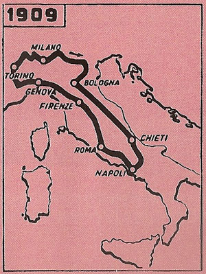Das entscheidende Ausschlusskriterium für einen geographisch ausgeglichenen ersten Giro muss hiernach im deplorablen Zustand der süditalienischen Straßen gesehen werden – ein Sachverhalt, der noch Jahrzehnte lang viele Gebiete des Mezzogiorno zu weißen Flecken auf der Radsport-Landkarte degradierte, denn straßeninfrastrukturell konnte der Süden erst in den 1950er Jahren, also knapp ein Jahrhundert nach der unità d'Italia mit dem Norden gleichziehen (vgl. Mioni 1980: 72).12 Die Urteile zur Straßenbeschaffenheit und -befahrbarkeit fielen bezüglich der süditalienischen Straßen demzufolge noch geraume Zeit vernichtend aus: "[N]elle regioni meridionali troppe strade sono una successione ininterrotta di buche, di cunette, di lastroni sporgenti, di ciottolame accozzato nel fango" (Ceriani 1926: 3).13 PhiN 60/2012: 81 Weit weniger explizit und in ihrer ganzen ideologischen Fundierung nur unter Berücksichtigung des seinerzeit geplanten Streckenverlaufs zu begreifen, nimmt sich die harmlos anmutende Wendung 'principali regioni geograficamente italiane' aus. War Neapel als südliche Wendemarke im Streckenverlauf vorgesehen, sah die erwogene Rundfahrtroute als Eckpunkte im Westen, Norden und Osten Städte wie Nizza, Trient und Triest vor, die zwar geographisch, aber zu jener Zeit eben nicht politisch zu Italien gezählt werden konnten. Diese irredentistische Bestrebung, speziell die unerlösten Gebiete unter habsburgischer Flagge (Trient und Triest) mittels der Aufnahme in den Streckenverlauf des Giro d'Italia symbolisch an die Heimat anzuschließen, zeigt das die rein sportliche Ebene von Anbeginn an übersteigende Bedeutungspotential der Italienrundfahrt. Wenn man berücksichtigt, dass der erste Giro durchaus als Ventil für angestaute Vaterlandsliebe diente – glaubt man der damaligen Radsportberichterstattung, bewirkte er bei der Bevölkerung "uno scoppio di patriottismo a lungo compresso, che aspettava soltanto un'occasione per erompere, per lanciare il suo grido di saluto e di gioia" (GdS 17.05.1909 zit. nach Colombo 1998: 70) –, erscheint es begreiflich, dass man letzten Endes (wohl auch aus Angst vor diplomatischen Krisen oder gar politischen Konflikten) von dem geplanten, äußerst heiklen Vorhaben abrückte und den tatsächlichen Giro 1909 in acht Etappen ohne Grenzübertritt auf nur italienischem Staatsgebiet stattfinden ließ (vgl. Abb. 3).