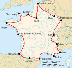 Abb. 3: Giro-Streckenplan 1909 PhiN 60/2012: 82 Wie sehr den Veranstaltern das Ausschöpfen der irredentistischen Symbolik dennoch auf der Seele gebrannt haben musste, beweist der Umstand, dass sowohl Trient als auch Triest bereits am gleichen Tage der österreichisch-ungarischen Kapitulation 1918 als Etappenorte des ersten Nachkriegs-Giro 1919 gefeiert wurden (vgl. GdS 04.11.1918). 14 Vor allem das seitdem auch radsportlich angeschlossene und erlöste Triest – "Trieste finalmente immacolata" (GdS 22.05.1919) – blieb während des Faschismus und auch noch nach dem Zweiten Weltkrieg aufgrund der jugoslawisch-italienischen Streitigkeiten um die Stadt mit nationalistisch-patriotischen Gefühlen besetzt: "[P]erché il 'Giro d'Italia' senza Trieste [è] una statua decapitata, un fiume senza sorgente, una impresa senza meta" (GdS 01.07.1946 zit. nach Facchinetti 2006: 108). Dies erklärt auch, warum Triest trotz seiner geographischen Randlage zwischen 1919 und 1961 bei 38 Editionen insgesamt 15-mal in den Rundkurs als Etappenort aufgenommen wurde.15 Diese Zahlen werden erst in Anbetracht der radsportlichen Minderberücksichtigung oder Unterrepräsentierung des italienischen Südens bedeutsam, der seinerseits vom Giro allzu oft selbst zur Peripherie degradiert wurde: In den Jahren von 1909 bis 1961 besuchte die Italienrundfahrt lediglich vier Mal Sizilien und verweilte ein einziges Mal (just 1961) für eine Etappe auf Sardinien.16 Im gleichen Zeitraum, der 44 Auflagen des Rennens entspricht, kam der Giro d'Italia auf seiner Reise durch Italien 33-mal nicht über den erweiterten Großraum Neapel (also einschließlich Caserta, Avellino und Salerno) als südlichstem Vorstoßpunkt hinaus – frei nach Carlo Levi: Il Giro si è fermato a Napoli… –, dreimal machte er sogar in Rom schon wieder kehrt (1912, 1920 und 1939). Wenn man bedenkt, dass sich nach Salerno noch über 400 Kilometer "Stiefelspann" bzw. "-spitze" erstrecken, muss man konstatieren, dass der Giro Italien mit großer Regelmäßigkeit bereits am Schienbein enden ließ bzw. immer noch lässt und damit eine ganz eigene radsportspezifische questione meridionale schafft.17 Die Gründe dafür können (vor allem heutzutage) nicht mehr nur bei organisatorisch-logistischen Schwierigkeiten oder infrastruktureller Insuffizienz liegen, sondern sind prinzipiell auch mit rennstrategischen, d.h. geographischen Aspekten in Verbindung zu bringen – denn ob oder wie gut einzelne Landstriche bzw. ganze Regionen in den Giro-Parcours aufgenommen werden können, hängt grundsätzlich davon ab, von wo die Rundfahrt gestartet wird und wo sie endet. Zur Erläuterung dieses Sachverhalts sei ein kurzer Blick nach Frankreich auf das Vergleichs- bzw. Bezugsmodell Tour de France gestattet: Sie gilt als Paradebeispiel, wie eine große Landesrundfahrt die Einheit(lichkeit) einer Nation betonen kann, indem sie – fortwährend "um einen Ausgleich zwischen Zentrum und Peripherie bemüht" (Scholler 2011: 43) – die zur Verfügung stehende Staatsfläche optimal ausnutzt. Mit Paris als unumstrittenen Bezugspunkt der francité und deswegen seit jeher auch als Endpunkt des Radrennens gesetzt, verlief die Tour de France von den ersten Austragungen an (seit 1903) bis in die 1950er Jahre hinein nach dem Grundsatz, die mère patrie mittels einer symbolischen Streckenführung vollständig einzukreisen bzw. zu umschließen – und zwar "sur les routes extrêmes qui bordent nos mers et les frontières de notre pays" (L'Auto 21.06.1924 zit. nach Gaboriau 1995: 47) (vgl. Abb. 4). PhiN 60/2012: 83