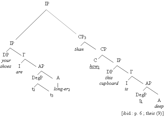 In sum, the attested translation mismatches and the apparent syntactic inadequacies thus present two initial puzzles for the traditional exceed-style approach suggested for Thai in Stassen (1985). 3.2.2 The Occurrence of Direct Measure Phrase Constructions, Degree Questions and SubcomparativesA further difficulty for an exceed-like account of comparison in Thai comes from the occurrence of particular types of comparison constructions in this language, because under such an account, the cluster of constructions ‘direct measure phrases’, ‘degree questions’ and ‘subcomparatives’ identified in Beck et al. (2009: 22f.) would be predicted to be unattested in the Thai language. This prediction follows from the observation that exceed-languages are characterised by a lack of degrees as such (ibid.) and the fact that abstraction over a degree variable constitutes an indispensable step in the derivation of all three constructions alike. To get an idea of how this process of degree abstraction is supposed to work in practice, the necessity of which was stressed as early as in Bresnan (1973) already, in (28) below, I reproduce the Logical Form proposed in Beck et al. (2009) for the English subcomparative given in (27), where the position at which the relevant process of degree abstraction takes place is indicated by underlining: