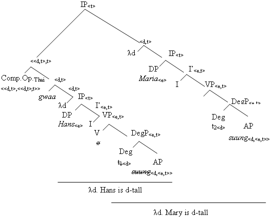 In (2c) below, I present the Logical Form underlying the basic Thai comparative (2b), which I annotate with semantic types as well as partial calculations for ease of understandability (strike off indicating elision of identical material), yielding the denotation listed in (2d) below, which is as desired, given that this corresponds exactly to what sentence (2b) arguably means:13 (2) c. LF: