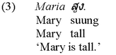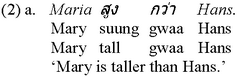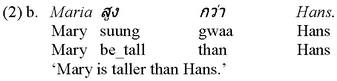 In a second step, I have then investigated possible ambiguities with potentially ambiguous sentences, the grammatical status of which had been established as completely uncontroversial beforehand, in that I have manipulated contexts and asked my informants to what extent they were willing to accept a test sentence in the context at hand on an analogous acceptability scale, once again involving judgments between “1” and “4”, an exemplary case of which will be shown with example (23) to be dealt with in subsection 2.2. As a matter of fact, checking for ambiguities by examining the appropriateness conditions of a given sentence constitutes an integral part of such an empirical investigation, because their respective occurrence or absence has far-reaching theoretical consequences, as will become clear in subsection 3.2.3 below. In what follows, I shall next summarise (a very limited number of) the results achieved from this study on comparison in Thai. 2.2 An Overview of Various Thai Comparison ConstructionsLet me begin my little survey of the individual comparison constructions attested in the Thai language with the four construction types that are usually considered to be basic: the comparative, the positive, the equative and the superlative. In Thai, a standard comparative is formed by the comparee term (Maria in (2a) below), followed by a gradable predicate (suung in the case at hand), which is in turn followed by a combination of the element gwaa and the standard term of the comparison (Hans):3