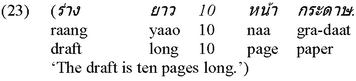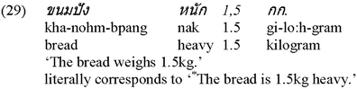 Obviously, if there are no degrees to start with, these surely cannot leave behind traces to abstract over. The empirical picture in Thai shows, however, that this prediction is totally incorrect: In fact, Thai does allow for direct measure phrase constructions (cf. (17), repeated from above), and surprisingly enough, Thai is even more productive in this respect than the English language itself, in that it permits this particular type of construction with a wider range of adjectives, as demonstrated in an exemplary fashion in (29) below, the English equivalent of which happens to be downright ungrammatical: