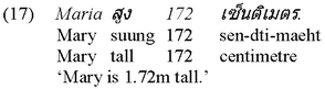 Moreover, I have also checked for the availability of a couple of related comparison constructions in Thai, such as degree questions, exemplified in (16) below, measure phrase constructions in which a gradable predicate directly combines with an overt measure phrase (172 sen-dti-maeht in (17)) as well as standard Thai too and enough constructions, as illustrated in (18) and (19), respectively: