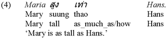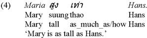 A canonical Thai positive consists in nothing but a comparee term and the gradable predicate itself, as can be seen from (3) below, and an equative is usually marked by the element thao (cf. (4)):