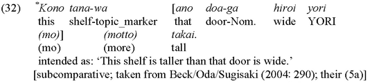 Interestingly enough, the availability of these three constructions not only sets Thai apart from classical exceed-languages as such and therefore creates an additional puzzle for an exceed-style analysis of comparison in this language, but at the same time, this property also distinguishes Thai from other East Asian languages: In this context, it has for instance been reported that Japanese does not allow for any of these special constructions, as can be seen from their totally ungrammatical statuses throughout (cf. (30), (31) and (32) below),7 nor does Mandarin Chinese (cf. the negative evidence provided in (33) to (35)):8