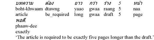 in a Language from Southeast Asia 1 IntroductionThe following article primarily focusses on presenting and summarising the main insights gained from a large-scale empirical study on comparatives and a considerable number of related comparison constructions in the Thai language, a topic which – to the best of my knowledge – has never been investigated in any comprehensive fashion, so far. Of course, such an extensive data study reveals numerous fascinating details, many of which would undoubtedly deserve a presentation of their own, but for the remainder of this little treatise, I should actually like to confine myself to these three major aspects: First of all, I intend to offer a brief overview of the most important comparison constructions attested in Thai; secondly, I envisage putting forth various arguments against classifying this language within the group of languages that is characterised by an exceed-style comparison, among which Thai happens to be counted in current linguistic literature; and thirdly, an alternative, degree-based approach to comparison in Thai will be proposed that can capture the empirical findings in this language in a much more adequate fashion. More precisely, the following section two briefly comments on the design of the empirical study I have run, it illustrates the most prominent comparison constructions available in the Thai language on the basis of natural example sentences, and it ultimately also verifies the necessity of carrying out genuine empirical fieldwork even within more formally oriented branches of linguistics, as has already been widely accepted and become standard in most other linguistic disciplines. |