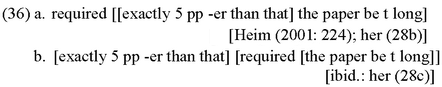 comes with both, an exactly-15-pages-in-total interpretation as well as a minimal requirement reading, just like its English counterpart. In the latter language, this ambiguity has standardly been explained by assuming that the comparative operator may undergo Quantifier Raising and thus scope either below or above the modal expression itself, as illustrated by the two respective Logical Forms sketched in (36a) and (36b) below, the first one generating the exactly-15-pages-in-total reading and the second one in turn giving rise to the minimal requirement interpretation: