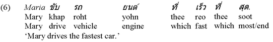 And Thai superlatives are typically characterised by a construction in which the relative pronoun thee both precedes and follows the respective gradable predicate and that is finally completed by the element soot, as illustrated in examples (5) and (6) below: |