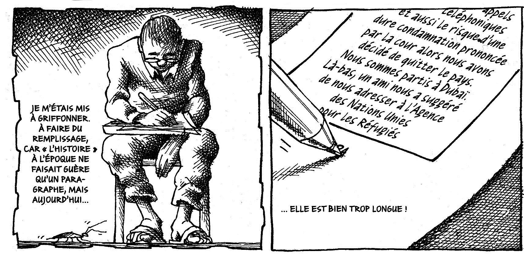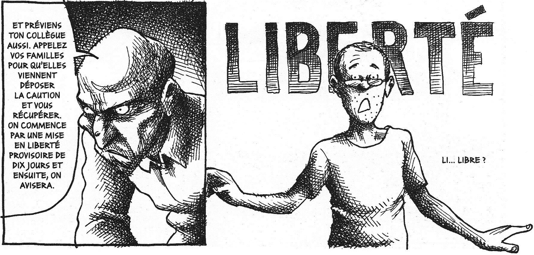 Fig. 7: UMI 45, Click on Image for Enlargement In this context, of course, UMI thematizes artistic freedom. After two months, surprisingly, Mana is temporarily released from Evin prison. The surprise is written in his face, and behind the artist-protagonist, we find in large capitals the lettering "LIBERTÉ [FREEDOM]" and further down to the right the very small caption, "Li… Libre? [Fr... Free?]" (UMI 119, fig. 8) This text-image15 may be read as a plea for artistic freedom (the capitals) and the questioning of it (small caption). The panel is a nonframe, thus catering to the idea of freedom, yet Mana's right hand touches the frame of the panel to his left, in which we see a grim prison attendant telling him about his temporary release. Thus, freedom is graphically and verbally restricted, limited to the one side of the panel which Mana does not touch. In these two panels, the verbal and pictorial together function as a metaphor of artistic freedom under totalitarian regimes like in Iran; with freedom thus restrained, border transgressions may happen without the artist's knowing of or intending it. PhiN 70/2014: 64