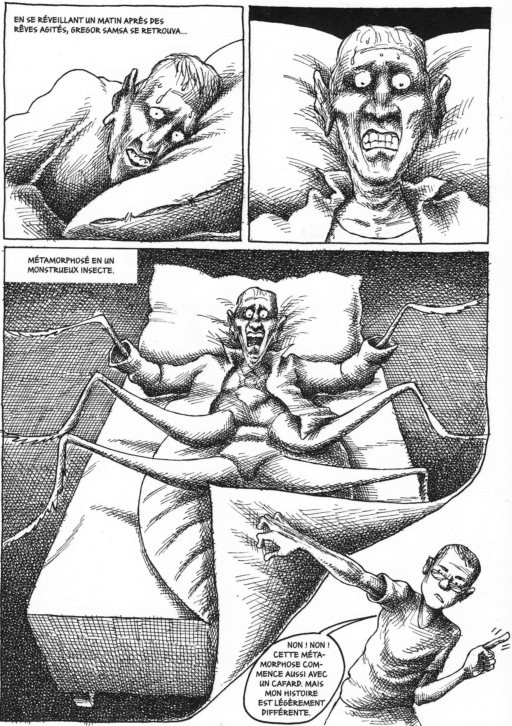 Fig. 5: UMI 16, Click on Image for Enlargement PhiN 70/2014: 62 The roach here is a metaphor of the ill-fated word namana, spreading from the weekly paper across borders into Azeri territory. – In one of his numerous nightmares by the end of the book, Mana is overwhelmed by the cockroach, whose face transmutes into Mana's mirror image and tells him, "Toi et moi, nous ne faisons qu'un ! [You and I, we're but one!]" (UMI 193 [all translations from French mine, AH]). As a matter of fact, in many episodes, Mana tries to kill the cockroach, which immediately comes back to life (cf. UMI 33, 175–6, 192); and in the final chapter, Mana realizes that they are not dissimilar and feeds it bread crumbs on the plane to Kuala Lumpur (UMI 199). One in the nightmare as in the 'real' diegetic world also is a metaphor, figuring one person too many, one to whom no country wants to grant asylum although his life is in imminent danger, a social outcast and political refugee. Mana's nightmares thicken the plot throughout the narrative, and in one instance, the same panels occur twice: the first time at the beginning of chapter two, when Mana is staying at Evin prison; the second time at the end of the penultimate chapter. In both instances, Mana dreams of a gigantic cockroach overwhelming him and of a Chinese airport security guard announcing Mana's (fictitious) internment at Goan Jo airport detention center (cf. UMI 34–5, 193–4). The dreaming of the metaphorical insect is, of course, an intertextual/intermedial reference to Kafka's Metamorphosis (1915).13 The first chapter of UMI begins with a rendition in the comics mode of Kafka's novella, depicting Gregor Samsa waking up in bed and finding himself transformed into an enormous roach (UMI 12, fig. 6).14 However, at the bottom right of the page, the artist-protagonist appears, lifting up the bottom-right corner of the panel, telling the readers, "Non ! Non ! Cette métamorphose commence aussi avec un cafard. Mais mon histoire est légèrement différente. [No! No! This metamorphosis also begins with a cockroach. But my story is slightly different.]" (Ibid.). What the artist-protagonist calls a 'slight difference' is the difference between Kafka's world-famous dream narrative and the allegorical graphic narrative about the hardships of seeking political asylum. In both narratives, the protagonists are transformed into insects: 'literally' in Kafka and metaphorically in Neyestani. This intertextual transgression is part of the framing of the plot, in which Mana, lifting up the panel corner, functions as the extradiegetic narrator of the prefatory as well as the other chapters of UMI.