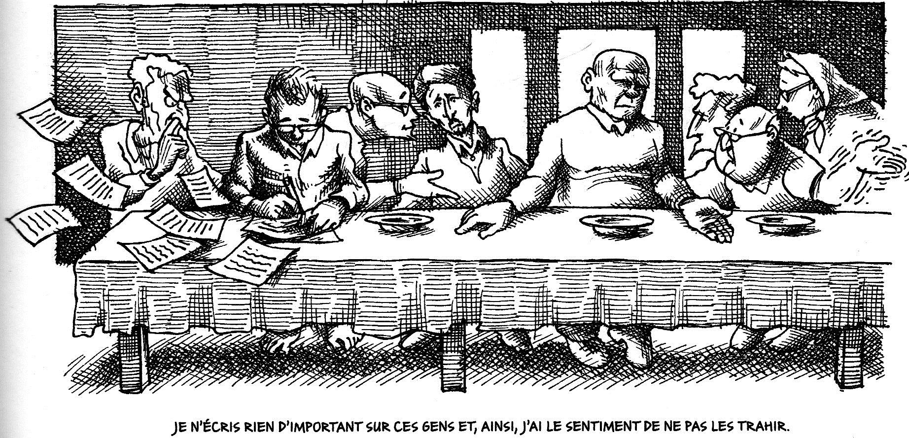 Fig. 6: UMI 12, Click on Image for Enlargement PhiN 70/2014: 63 Apart from Kafka's Metamorphosis, Neyestani parodically refers to another world-famous intertext: Leonardo da Vinci's mural painting The Last Supper (Milan, 1495–8): at Evin prison in Iran, Mana is urged to write down what he knows about his artist colleagues. At the end of the page, Mana depicts himself as a kind of Judas Iscariot, sitting at the table with his artist colleagues, filling sheets with more or less innocuous information (UMI 20–1, fig. 7). The caption reads: "Je n'écris rien d'important sur ces gens et, ainsi, j'ai le sentiment de ne pas les trahir. [I am writing nothing important about these people, so I feel like not betraying them.]" (UMI 45) The parodic use of masterpieces of Western European high art to criticize the inhuman practices of the totalitarian Iranian regime is a shrewd device of Neyestani's to appeal to Western readers and open their eyes to conditions which are not limited to his home country. Doing so, he takes the artist down from the pedestal of public appreciation as he lines him up in his graphic work with the normal people who share a similar fate and are considered 'too much' (like roaches).