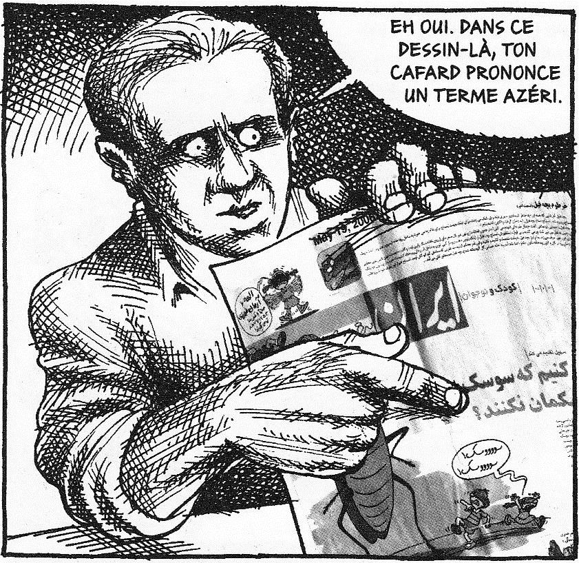 Fig. 8: UMI 119, Click on Image for Enlargement As a whole, UMI is a highly metafictional graphic narrative.16 This gains in significance against the background of the publication of the Mohammed caricatures in the Danish daily Jyllands-Posten (2005), brought back to public attention in the wake of the Muslim riots on September 11, 2012, stirred in turn by the YouTube posting of the trailer to the anti-Islamic low-budget movie The Innocence of Muslims (2012), whose artistic value has been generally denied. Similarly, making and reading comics generally is not an innocent activity, at least not anymore in our times, even if authors do not have sinister intentions when they create them. Comics may contain 'explosive content' for specific readers (as in Neyestani's case) because the readers' reception of comics depends, of course, on their socio-cultural and political context. Thus, in the first chapter, Mana is called in by his editor-in-chief, Mehrdad, who has received calls from angry Azeri parents disapproving of Mana's cartoon. The page that Mehrdad shows Mana and points his finger at looks like the photograph of the authentic newspaper page that caused the trouble; by employing shades of grey as well as pixelating, it occurs as a more realistic representation than the rest of the images in the graphic novel (fig. 9), in which rough pencil strokes and cross-hatching dominate. The fact that the newspaper page is more (photo-)realistic than all the other images seems to underscore that something unreal, fictional in nature, can become something very real in what it triggers. In other words, the fictional here transgresses the border to the diegetic factuality. The Azeri readers take the cartoon as a real offense against their ethnicity although this was by no means intended by the artist. PhiN 70/2014: 65
